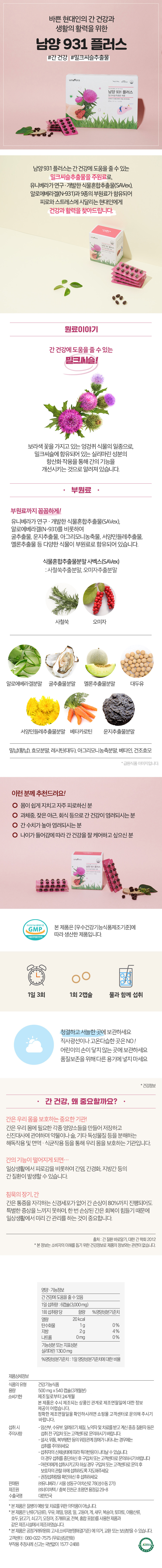 밀크씨슬추출물(미국산), 대두유(대두,아르헨티나산), 식물혼합추출물분말[사벡스(SAVex)-사철쑥추출분말,오미자추출분말], 알로에베라겔분말(200:1), 굴추출물분말, 운지추출물분말, 밀납(황납), 효모분말, 레시틴(대두), 아그리모니농축분말, 서양민들레추출물분말, 멜론추출물분말, 베타인, 건조효모, 혼합제제(베타카로틴 30%) -캡슐기제-젤라틴(돈피), 글리세린, D-소르비톨액, 치자그린혼합제제(천연색소)